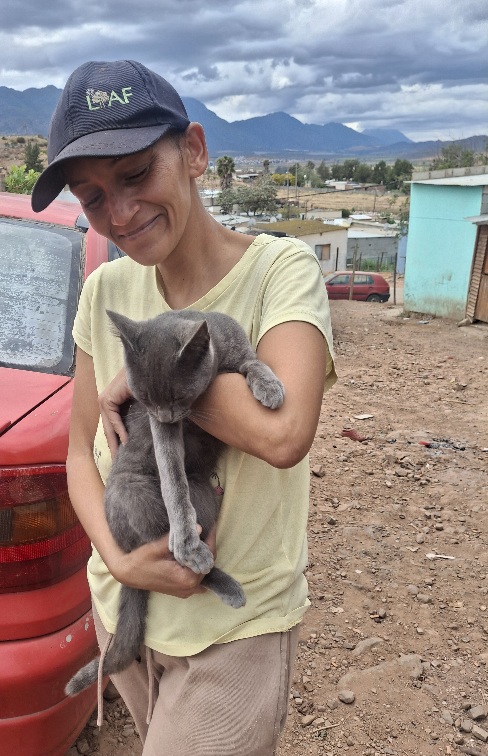 Fadia lives in the informal settlement of Ashton with her boyfriend and one child. Her boyfriend finds work sporadically. Kitsie is in beautiful condition and is much loved. She has not yet had kitties.