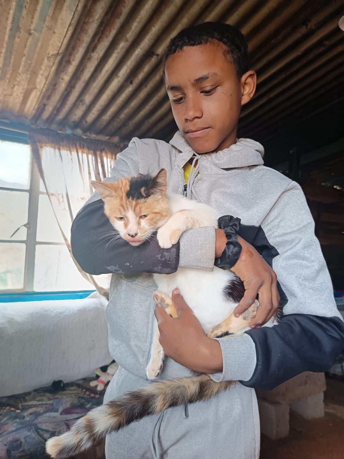 Sarie, her husband and son all live in a tiny but very neat cosy shack with their cat Susie whom they adore. Neither parent has work at the moment and the son attends high school.